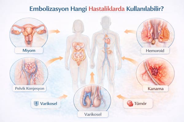 Embolizasyon tek bir hastalığa ait bir işlem değildir. Tam tersine, kan akımı üzerinden fayda sağlanabilecek çok farklı durumlarda kullanılabilir. En sık bilinen örneklerden biri rahim miyomlarıdır. Özellikle ameliyat istemeyen ya da rahmini korumak isteyen uygun hastalarda miyom embolizasyonu iyi bir seçenek olabilir. Bunun dışında erkeklerde varikosel, bazı hemoroid tipleri, pelvik konjesyon, bazı kanamalar, travmaya bağlı damarsal yaralanmalar ve bazı tümörlerin kanlanmasını azaltmaya yönelik işlemler de embolizasyon kapsamına girebilir.