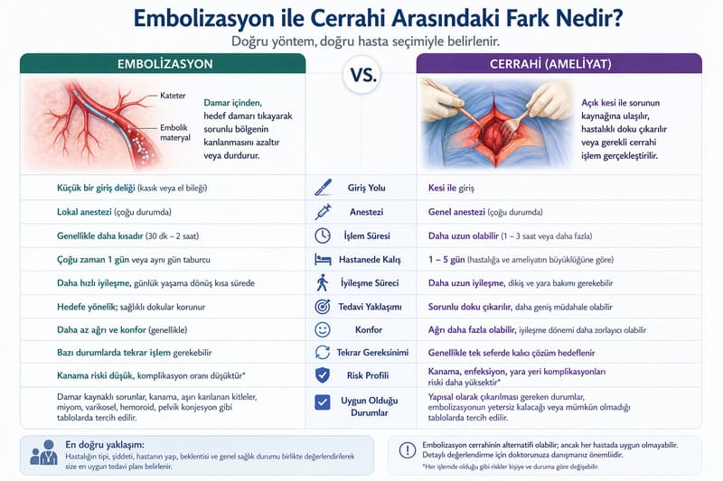 Embolizasyon ise daha çok damarsal mekanizmanın ön planda olduğu, hedefe yönelik tedavinin mümkün olduğu ve açık cerrahiden kaçınmanın anlamlı olabildiği durumlarda avantaj sağlar. Kesi, anestezi, hastanede kalış ve iyileşme süresi açısından farklılıklar olabilir. Ama burada önemli olan yöntemi savunmak değil, doğru yöntemi seçmektir.