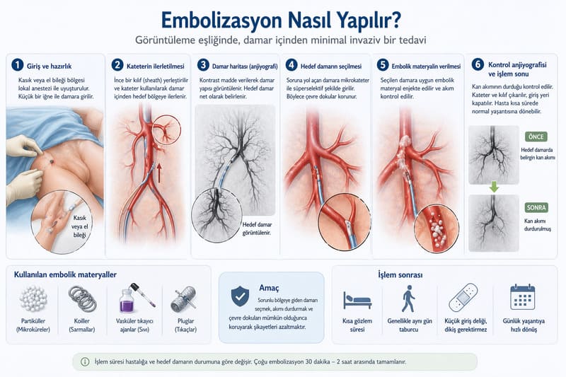 İşlem çoğu zaman kasık ya da el bileği damarından başlanarak yapılır. Önce o bölge lokal anesteziyle uyuşturulur. Ardından ince bir kılıf ve kateter yardımıyla hedef damara ilerlenir. Bu sırada anjiyografi ve floroskopi gibi görüntüleme yöntemleri kullanılır. Yani işlem “körlemesine” yapılmaz; damar haritası gerçek zamanlı olarak görülür. Hedef damar netleştirildikten sonra uygun embolik materyal verilir ve akım kontrol edilir.